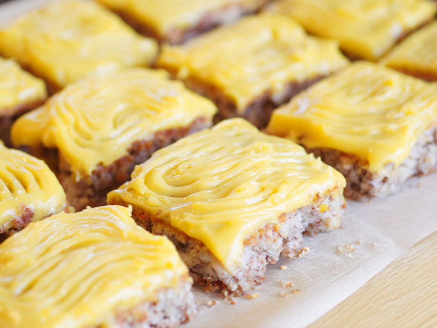 Prøv å bake den dere også! Her finner dere en oppskrift som passer til en stor langpanne. Kremen blir veldig tykk og den er fin til å lage mønster i. Se etter mønster i boka og lag striper, former og spor med en gaffel i kremen.