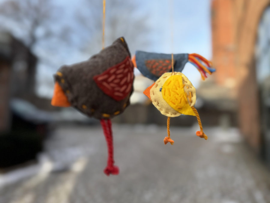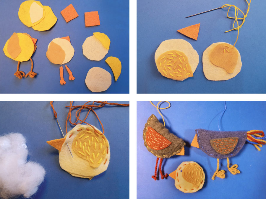 - Lag fugler: Sy på vingene først. Brett eller legg delene til kroppen sammen. Legg nebb, bein, stjert, hanekam og det du vil pynte fuglen din med, mellom lagene. Her kan dere være kreative og prøve dere frem! Sy så fuglen sammen. Sy langs kanten nesten helt rundt. Når du har en åpning på ca. tre cm. igjen, kan du fylle fuglen med vatt eller stoff. Sy helt igjen. Sy til slutt på øyne og tråd slik at du kan henge opp fuglen i uroen.