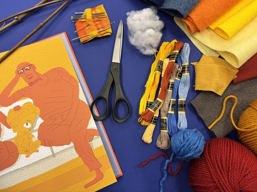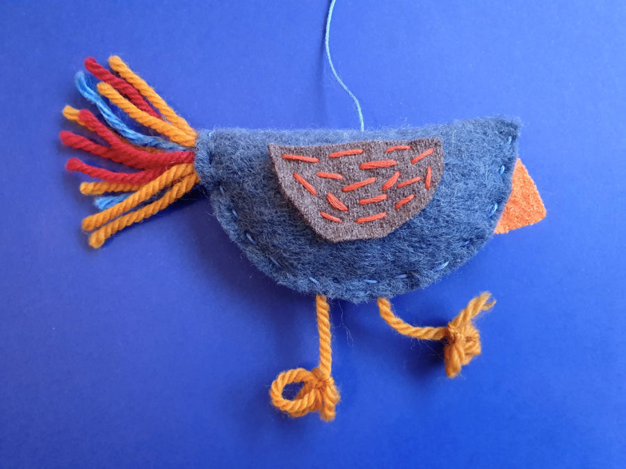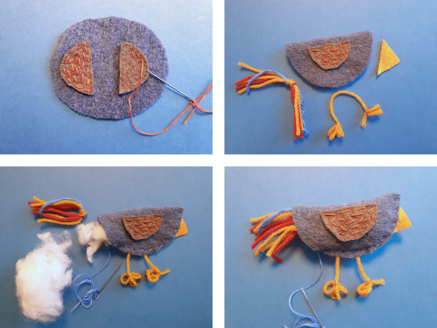 - Finn stoffrester, garn og ullfilt som passer sammen. Dere kan gjerne la dere inspirere av farger og mønstre i boka «Fremmed mann». På bildene har vi brukt en blanding av ullfilt, krympede ullgensere og stoffrester. Velg stoffer som er lette å sy i og som ikke rakner så lett. Bruk broderigarn til å sy med. Det er mye lettere å sy med enn ulltråd, og gir fine mønster og detaljer på fuglene.