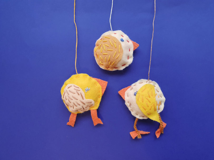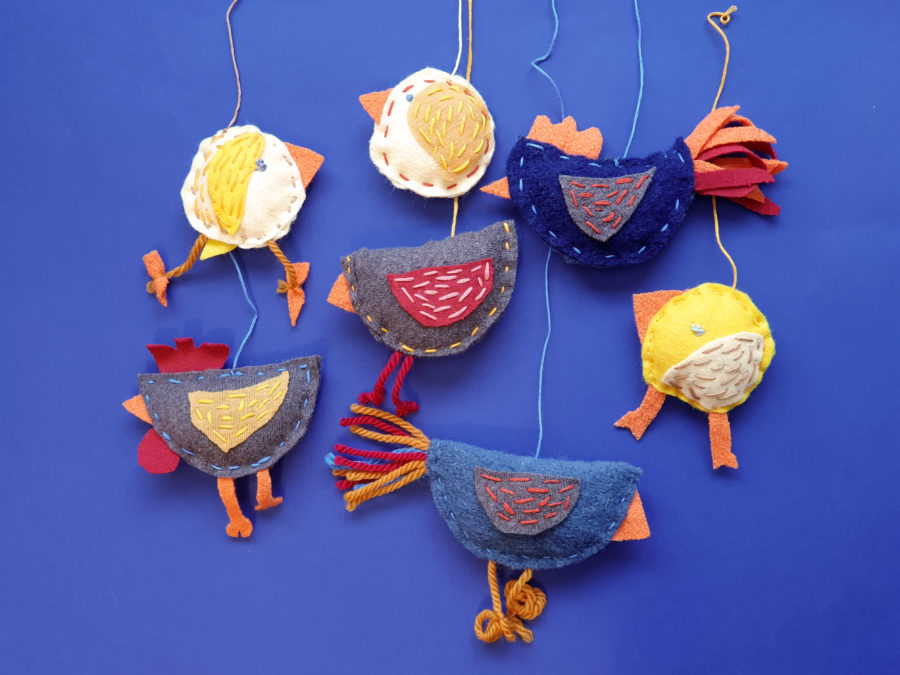 Lag kyllinger: Sy på vingene først. Legg delene til kroppen sammen – med vingene ut. Legg nebb og eventuelt bein mellom lagene. Sy fuglen sammen. Sy rundt kanten nesten helt rundt, stapp inn litt fyll i åpningen. Sy igjen. Sy på øyne og tråd til å henge den opp i.