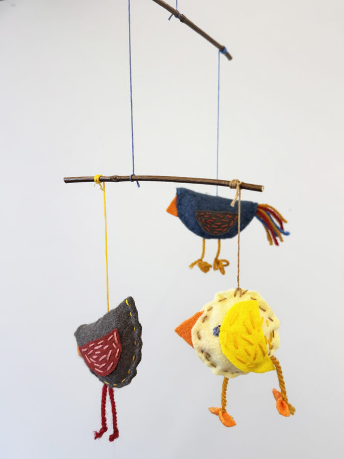 Bruk rette kvister og del dem opp i passe lengder. Heng på fuglene slik at det blir balanse. Det kan være lurt å knytte fast tråden på en sånn måte at den kan skyves litt frem og tilbake på pinnen for å finne riktig balanse.