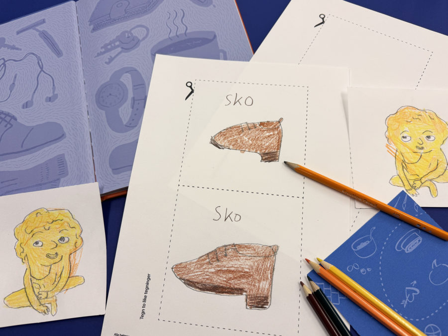 Bla i «Fremmed mann» og se om dere finner tegninger av ting og figurer som dere kan tegne på kortene. Det kan for eksempel være: en sko, en sofa, en kaffekopp, et par briller, en tannbørste, egg og mel osv.