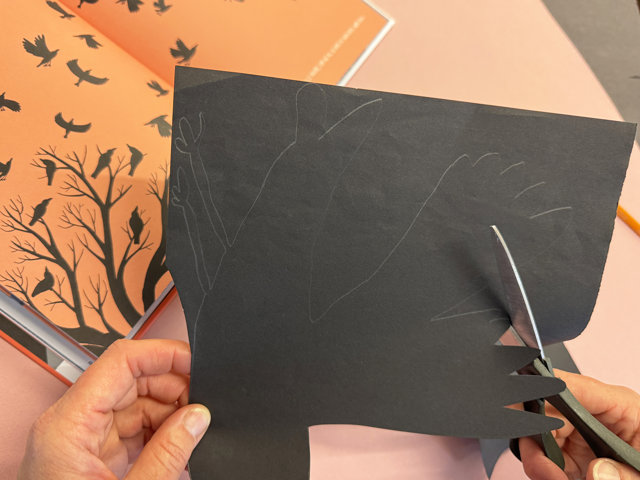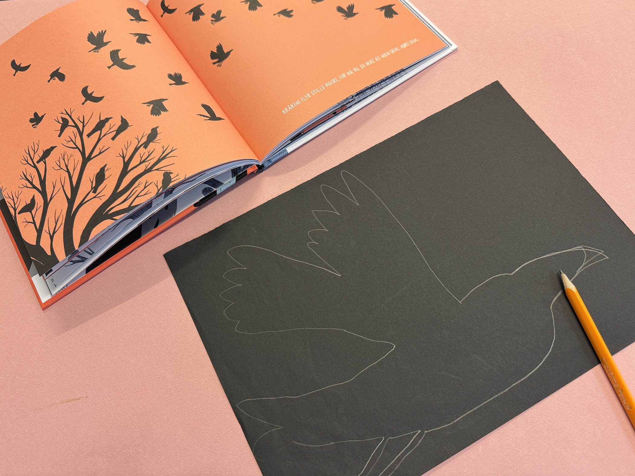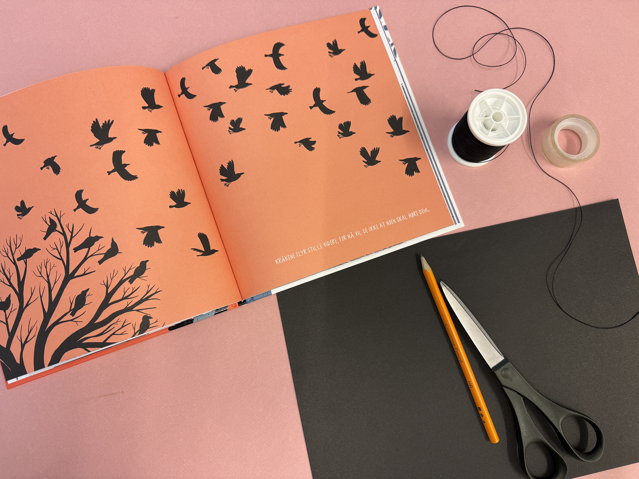 Herm etter kråketegningene i boka, tegn omriss med blyant på sort papir og klipp ut. Heng opp silhuettene med tape på vinduet, eller heng dem på hyssinger på tvers av rommet.