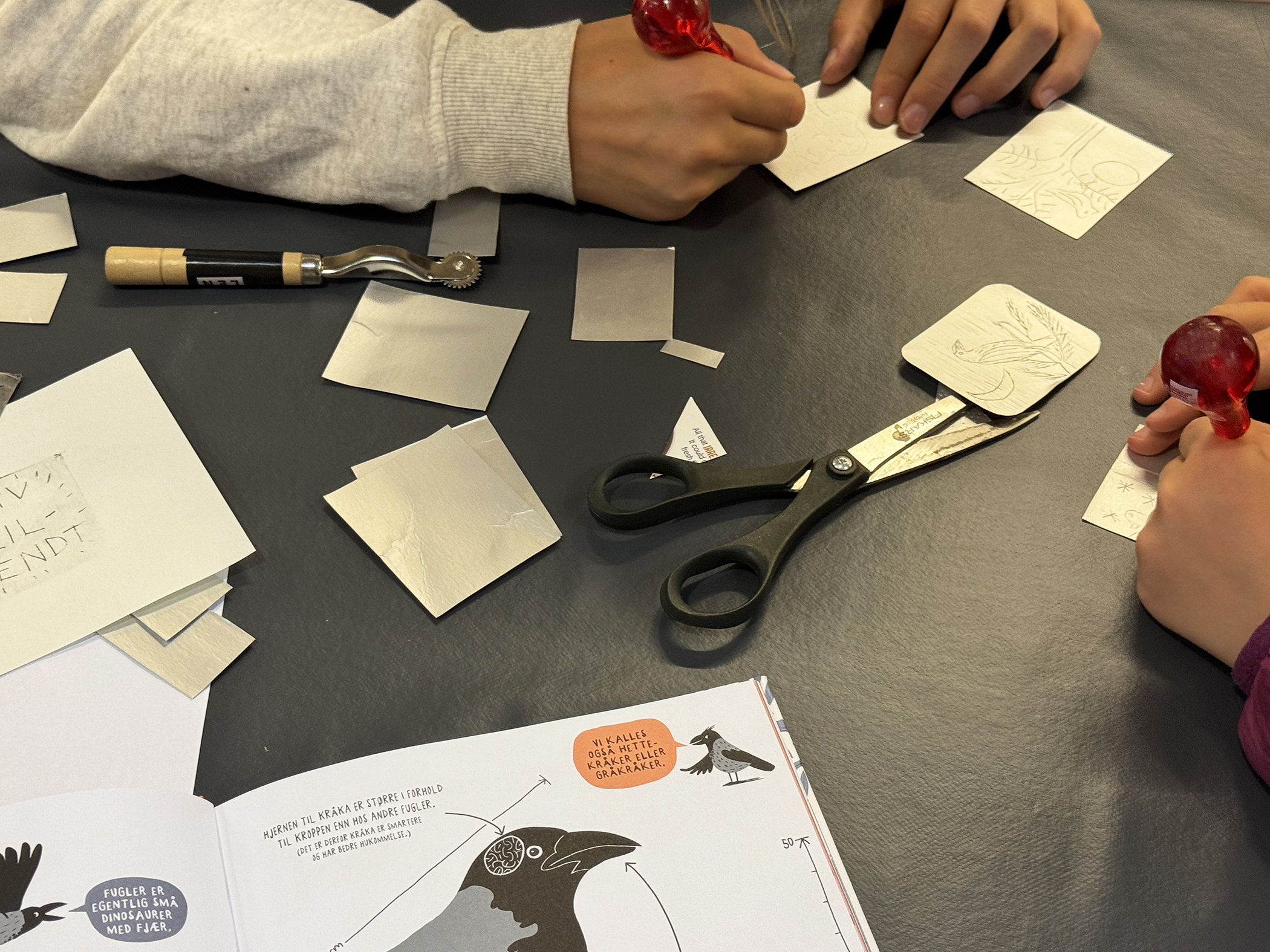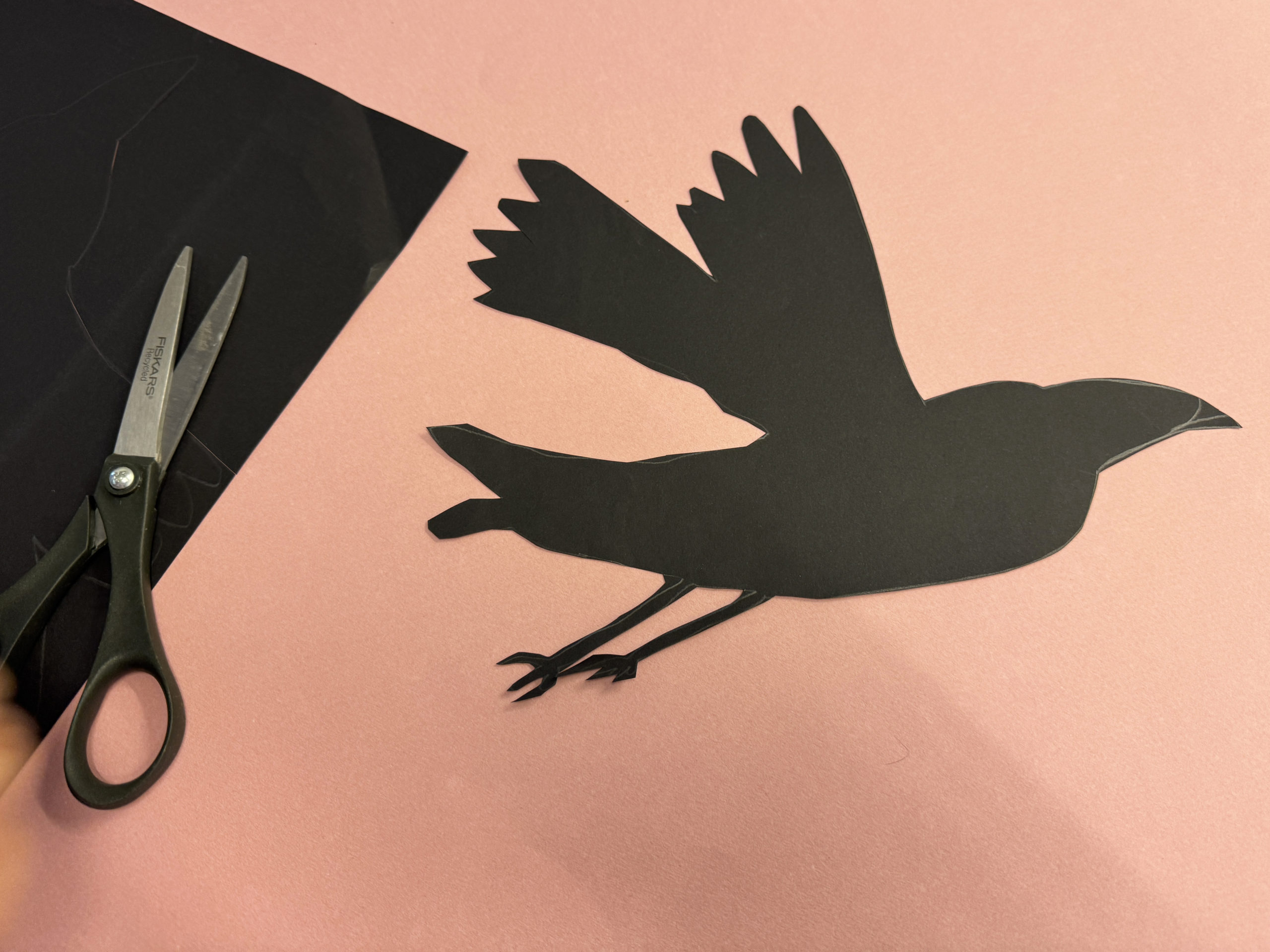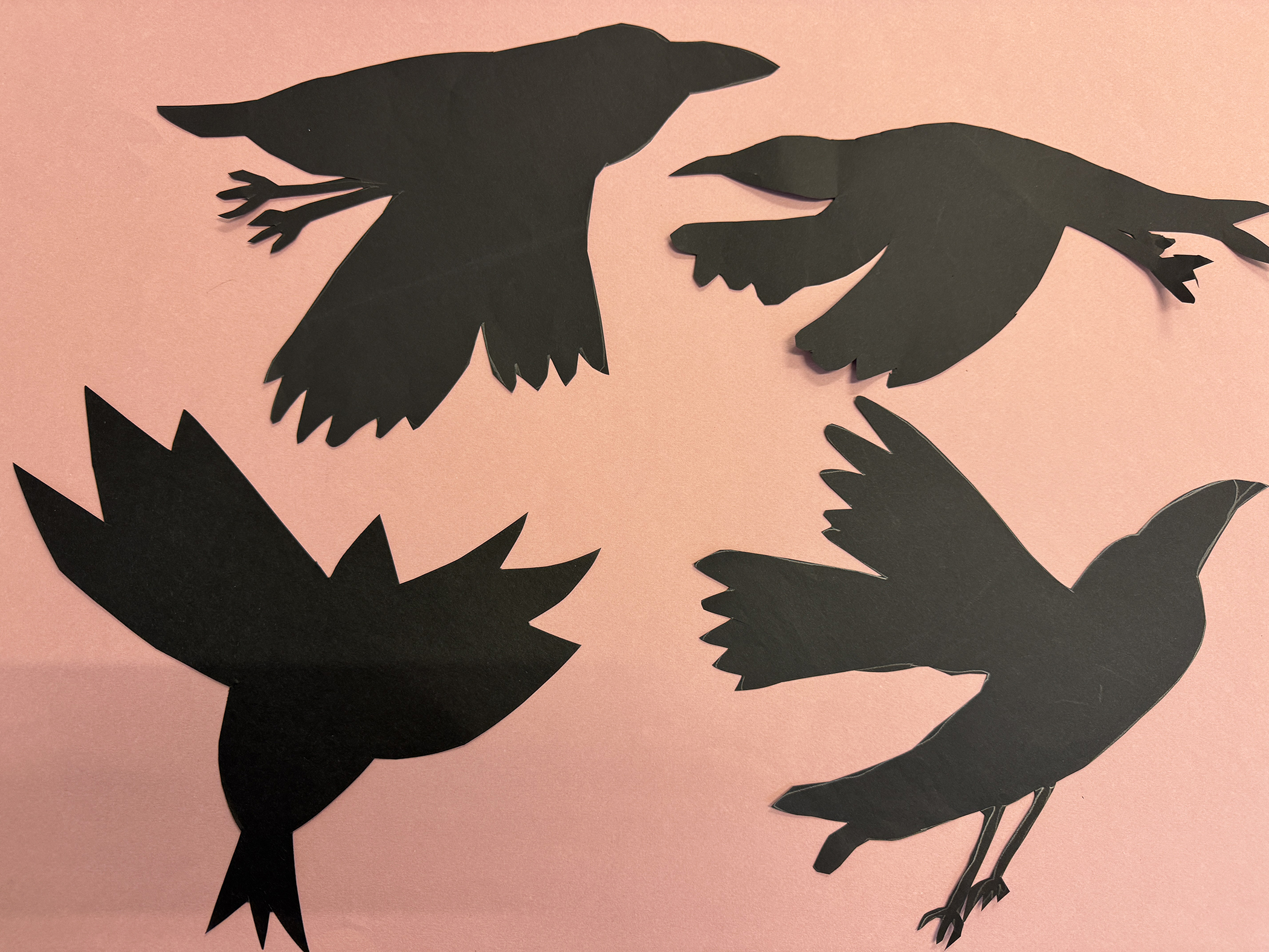 Herm etter kråketegningene i boka, tegn omriss med blyant på sort papir og klipp ut. Heng opp silhuettene med tape på vinduet, eller heng dem på hyssinger på tvers av rommet.