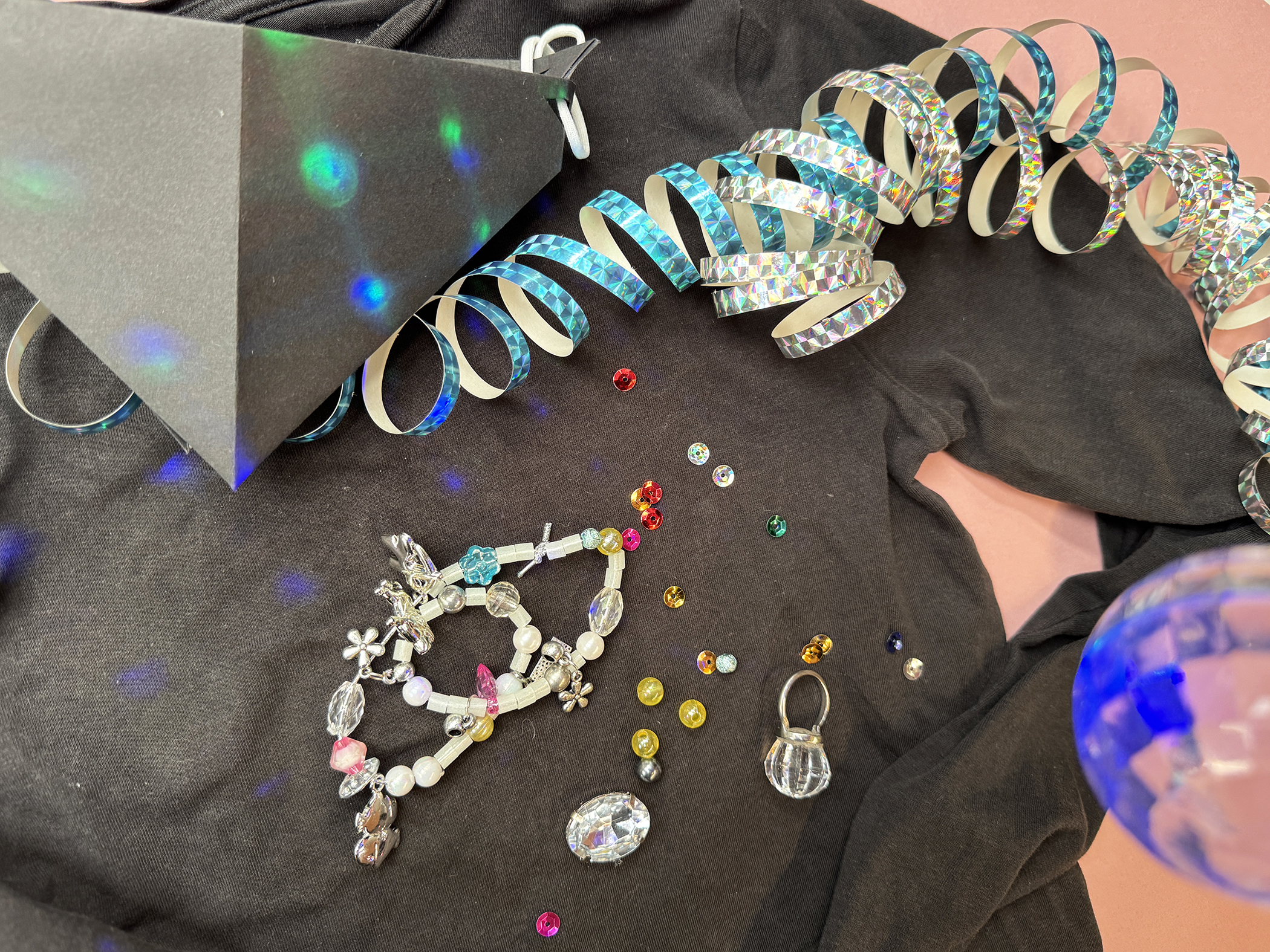 Finn frem sorte og grå klær, gå på skattejakt etter blinkende ting eller lag smykker selv med perler og glassdiamanter. Kanskje kan det lånes et armbånd eller to hjemmefra også?