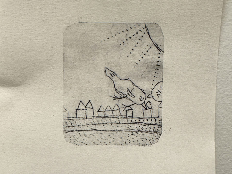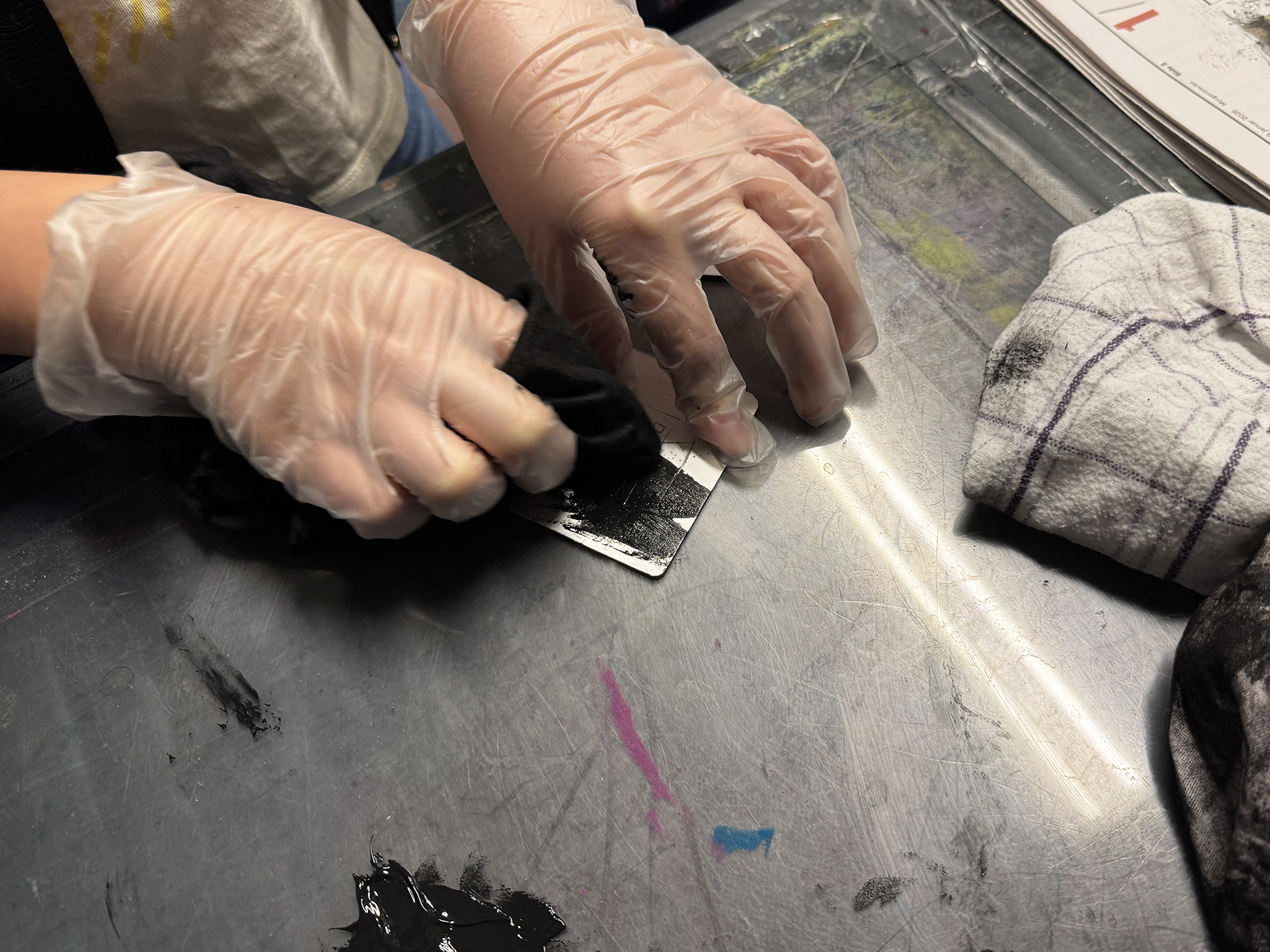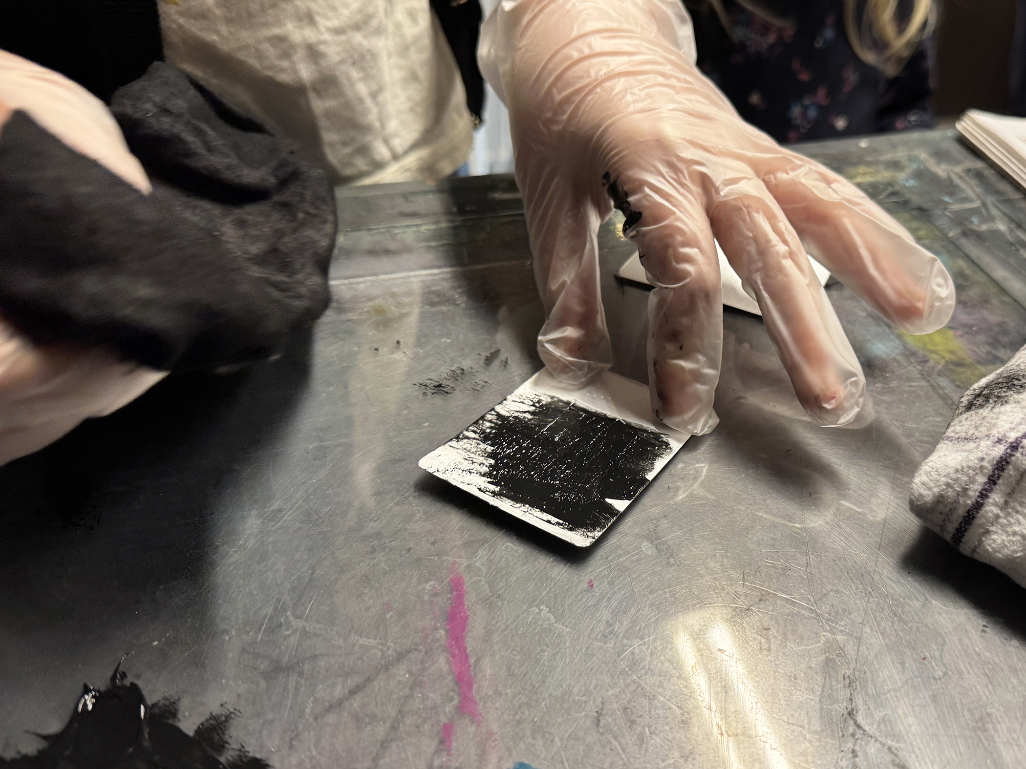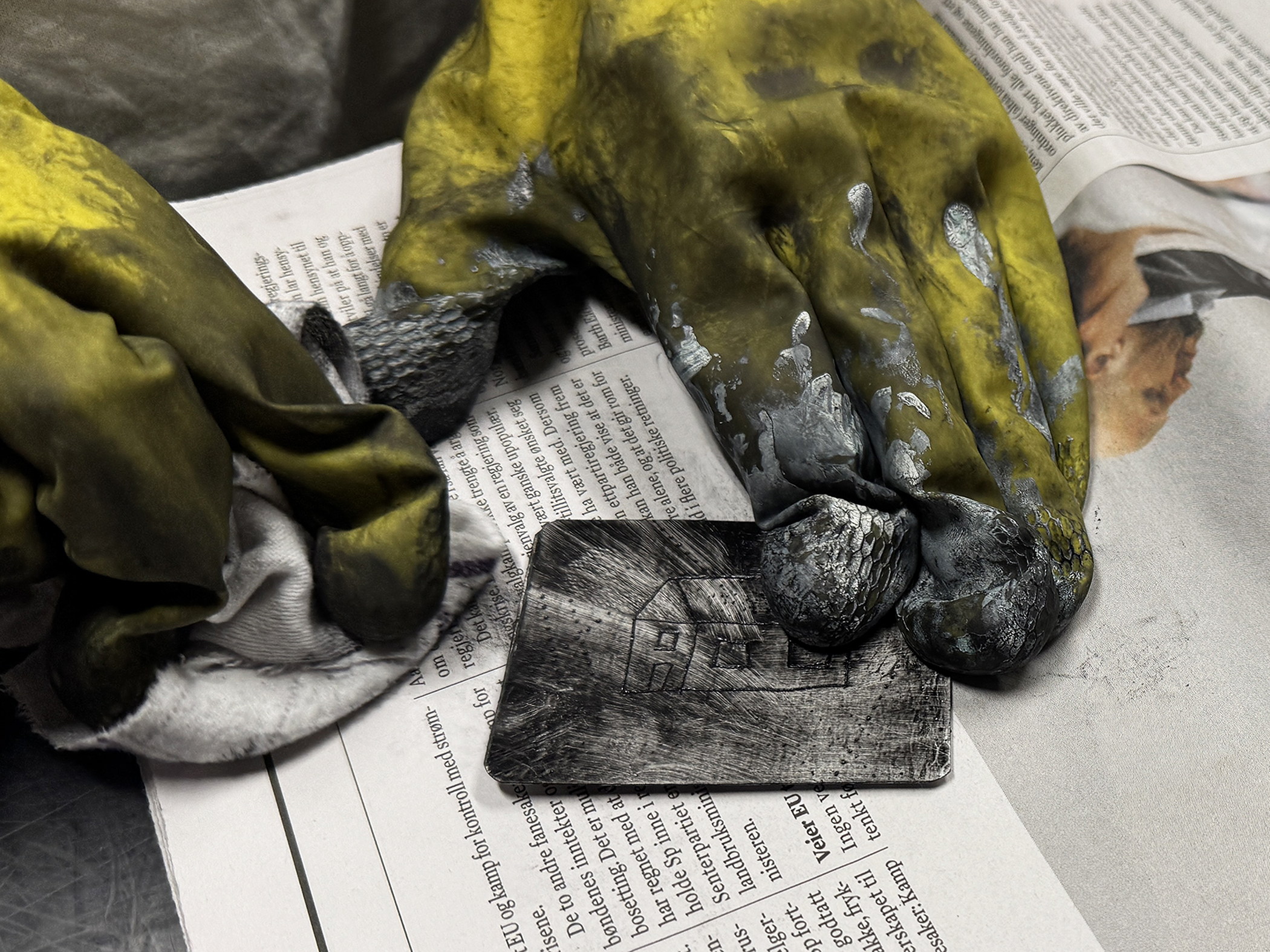 3. Dekk til et bord med aviser og ta på maleklær. Gni inn sort trykksverte med en tøybit på pappbiten/platen din. Fyll godt inn med lett trykk på strektegningen. Etterpå tar du en ny klut og tørker vekk sverte fra platen, slik at det bare er strekene du har risset inn som er fylt med farge.