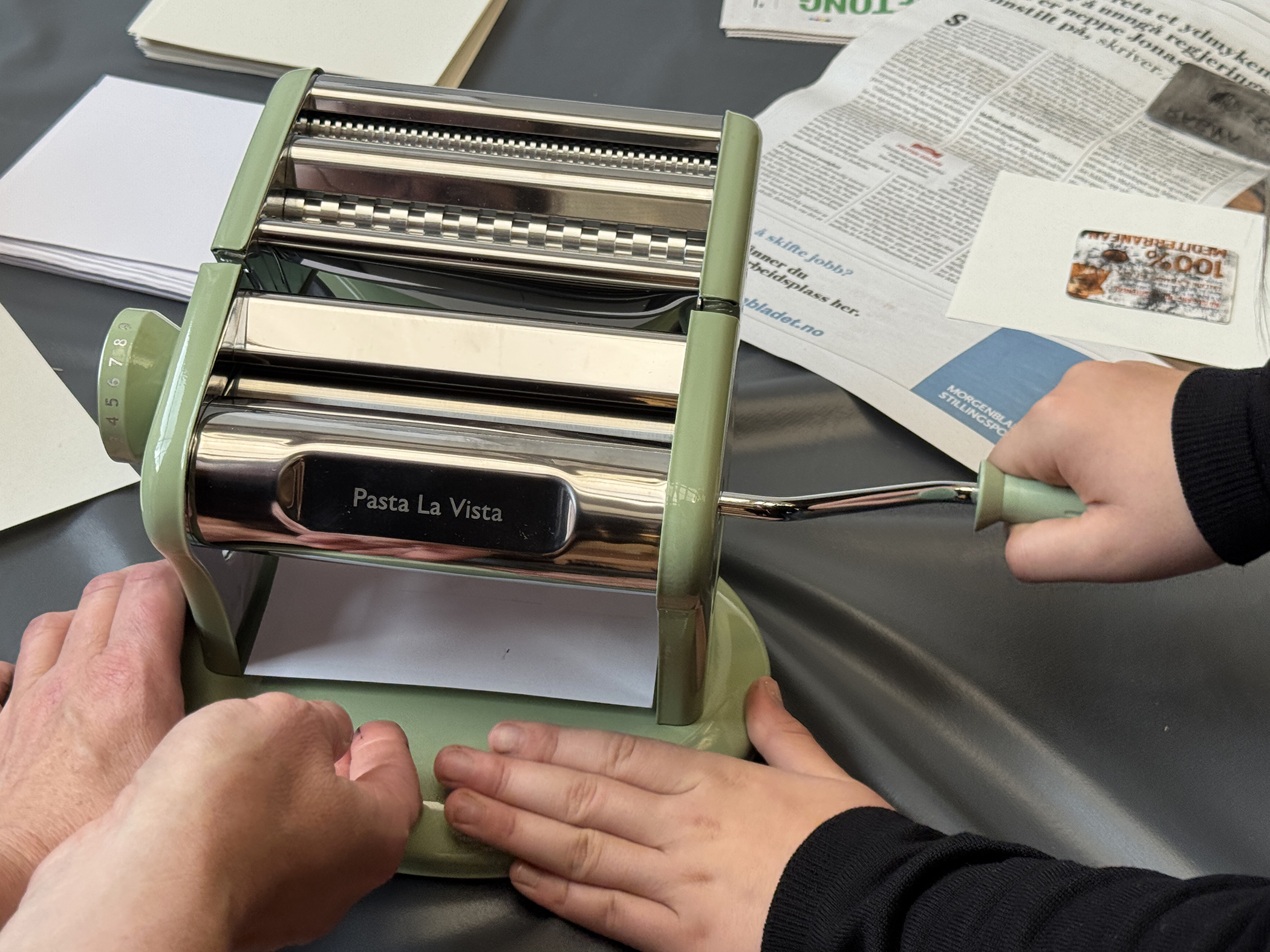4. Legg platen din opp ned på papiret du vil ha trykket ditt på. Legg et annet ark over og et annet ark under papiret, slik at platen er imellom flere papirlag. Hold på selve platen gjennom papiret i det du løfter papirene og fører dem inn i pastamaskinen. Velg smalest mulig åpning så presset bli mest mulig. Sveiv igjennom en gang, det skal være litt motstand i sveivingen, og én holder på papiret og én sveiver. En voksen kan helpe til med å holde pastamaskinen stødig.