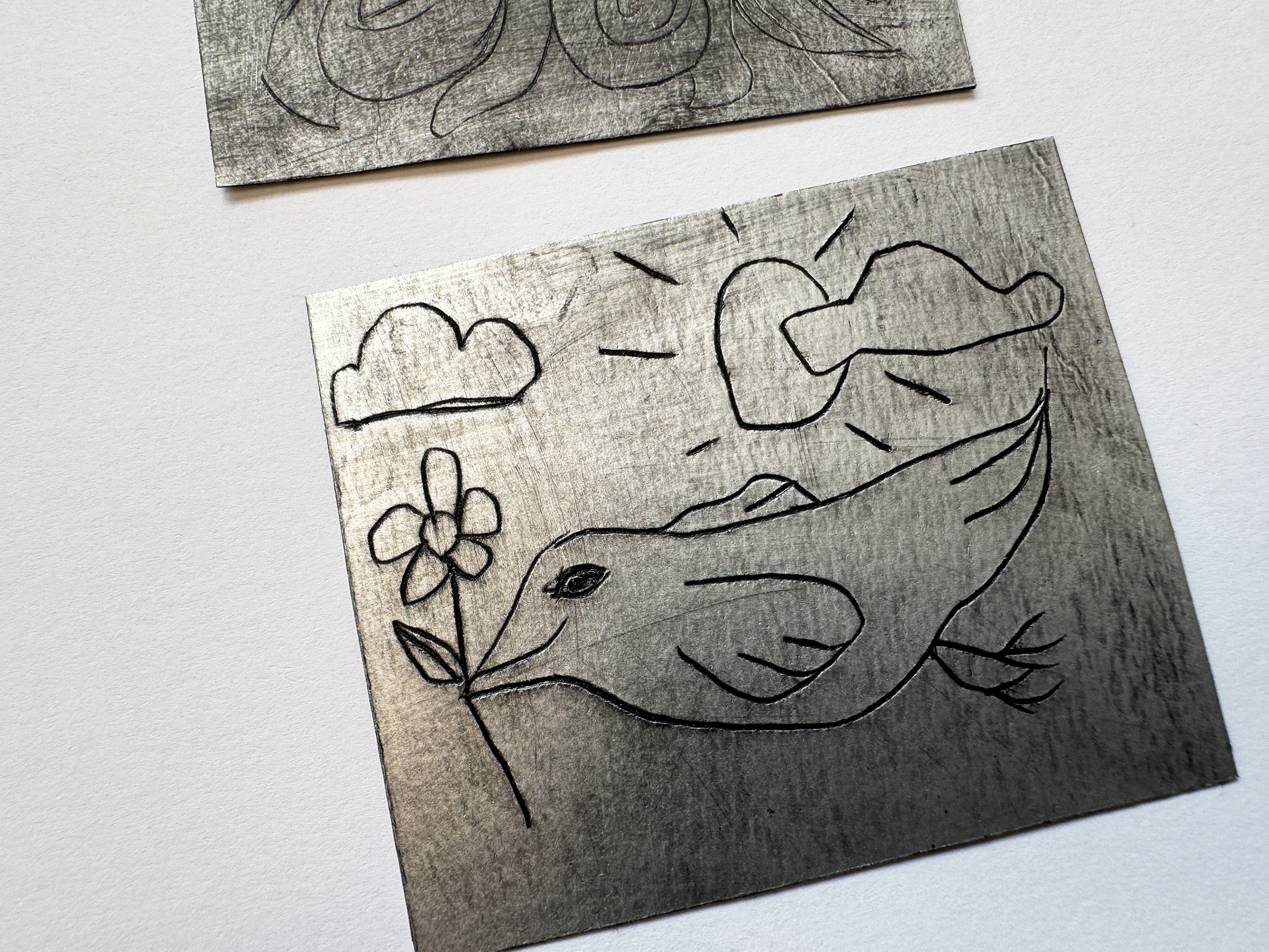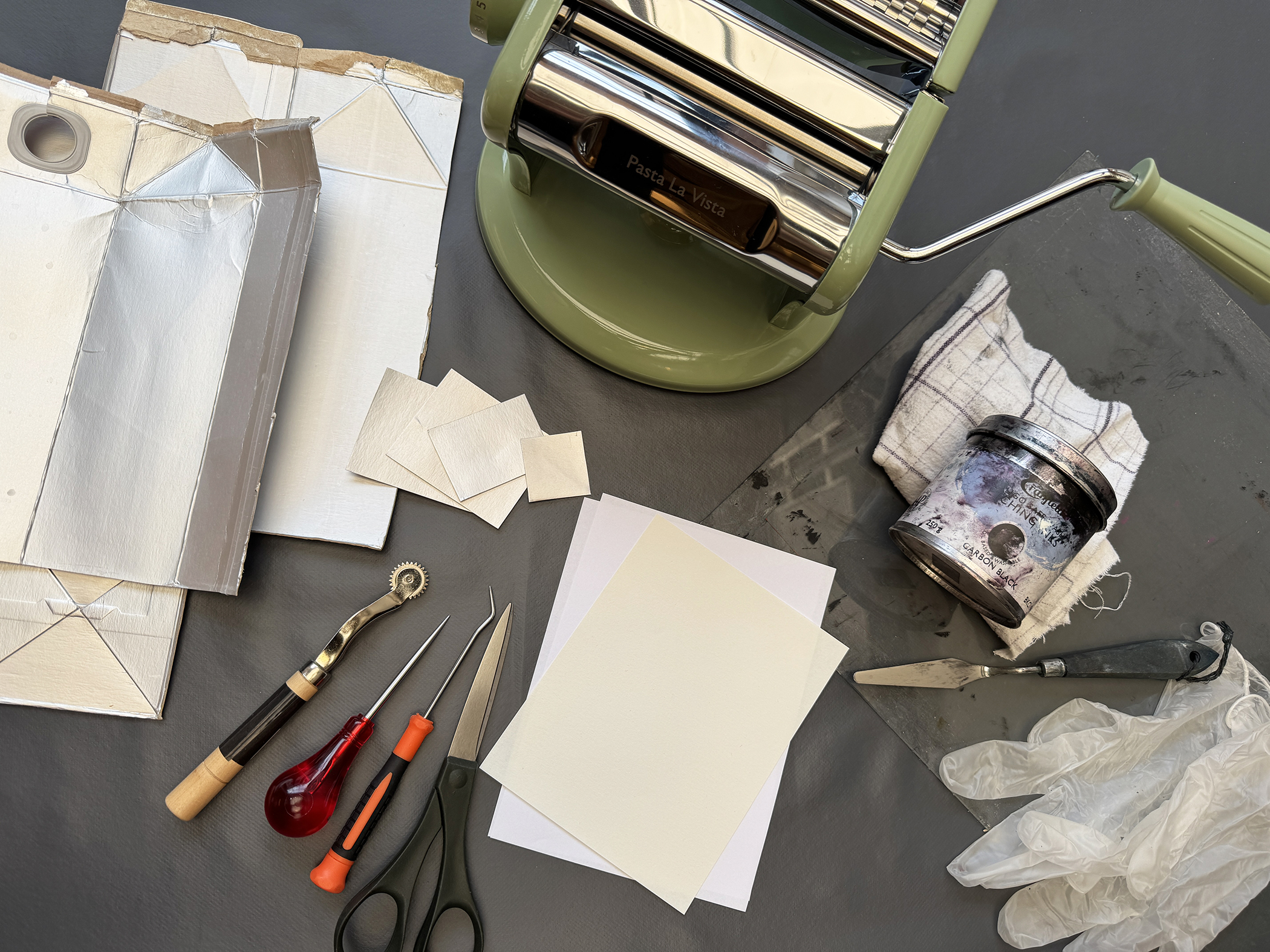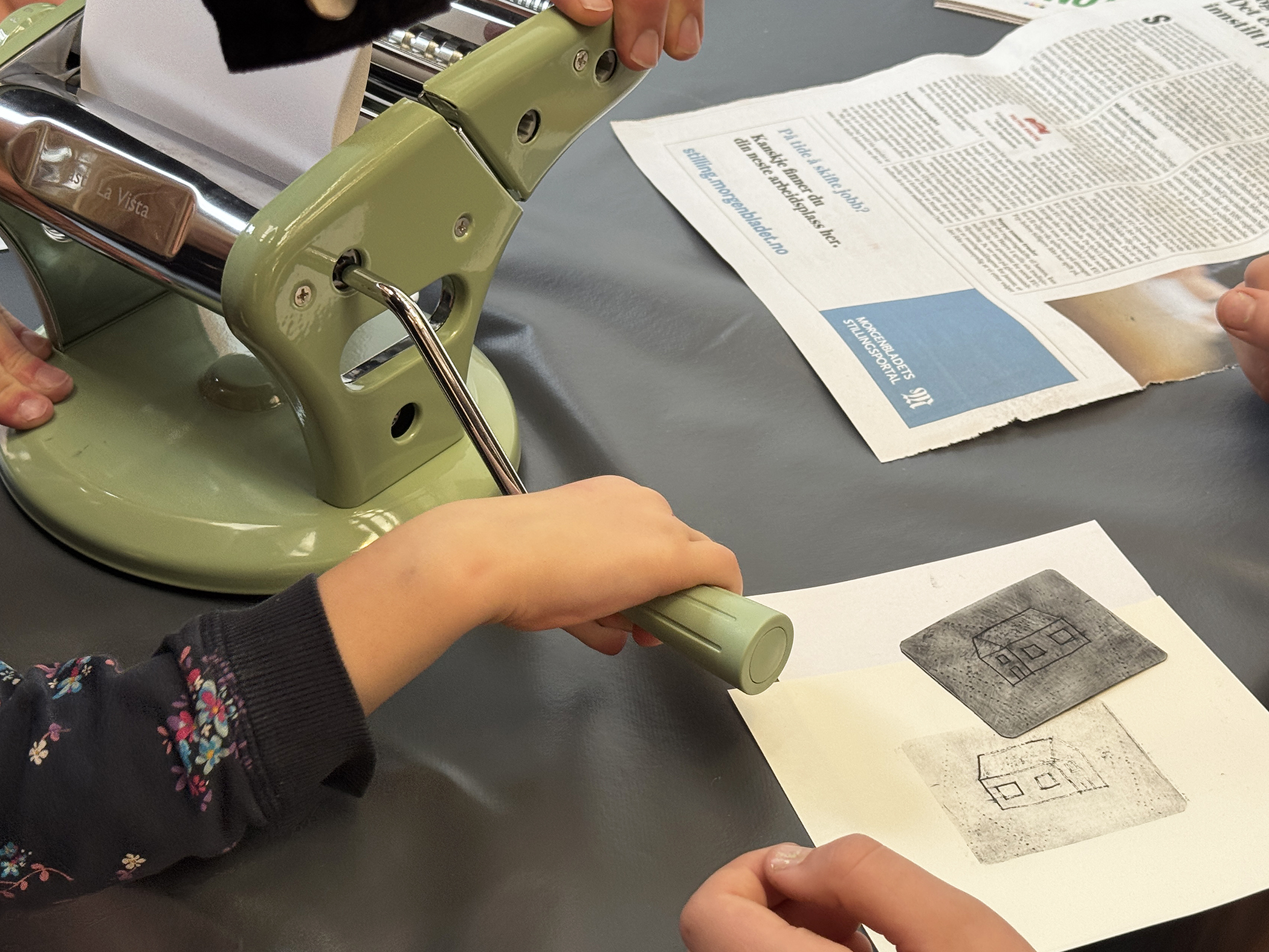 Med utgangspunkt i en pappbit fra kartonger med en sølvskimrende innside, tegnes motiver inn med en spiss gjenstand, farge smøres inn og tørkes av igjen slik at fargen settes i rissesporene, pappbiten legges på et papir og sveives igjennom en pastamaskin – og vips og magi – så har dere et ferdig lite trykk!