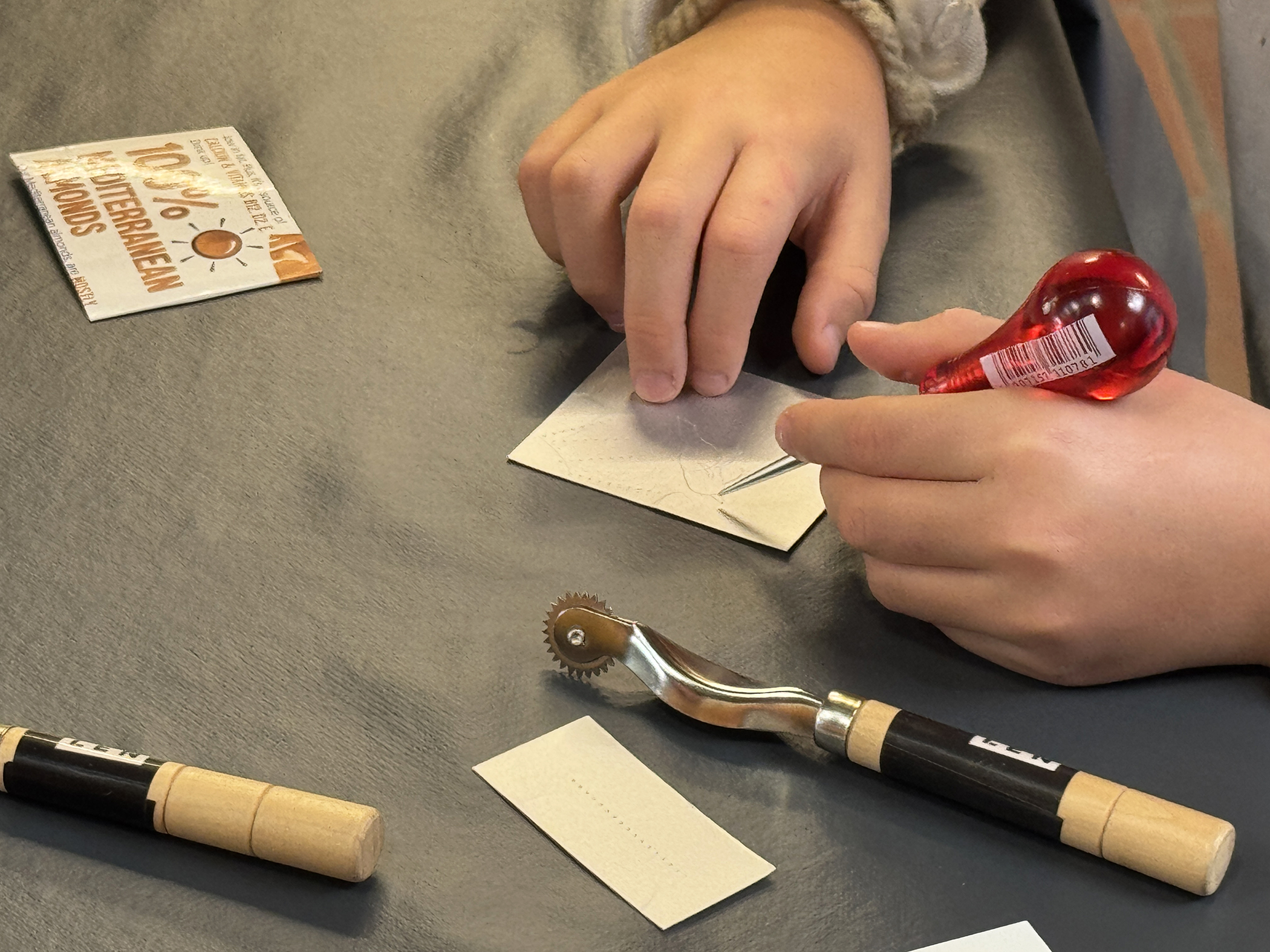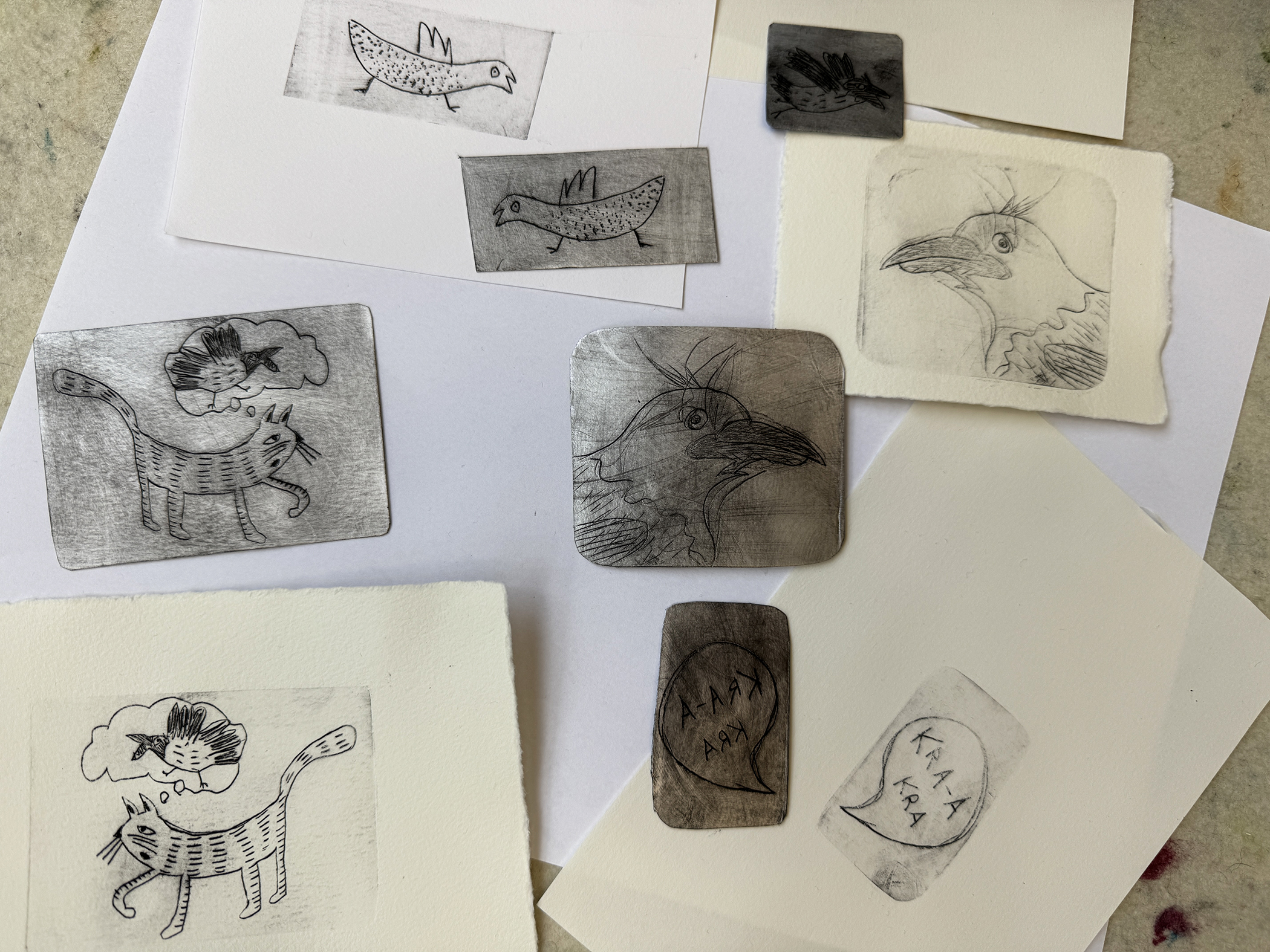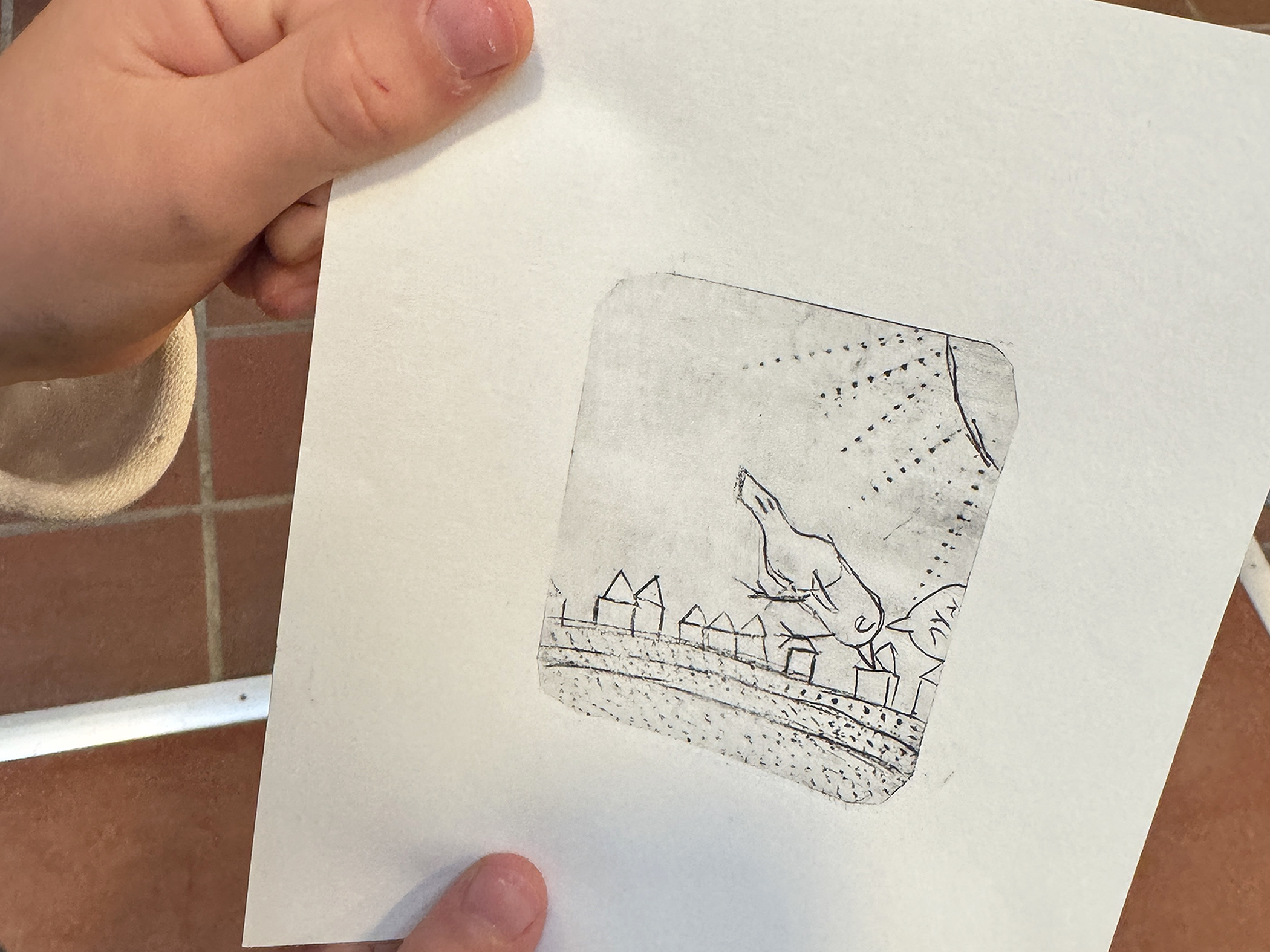 Med utgangspunkt i en pappbit fra kartonger med en sølvskimrende innside, tegnes motiver inn med en spiss gjenstand, farge smøres inn og tørkes av igjen slik at fargen settes i rissesporene, pappbiten legges på et papir og sveives igjennom en pastamaskin – og vips og magi – så har dere et ferdig lite trykk!