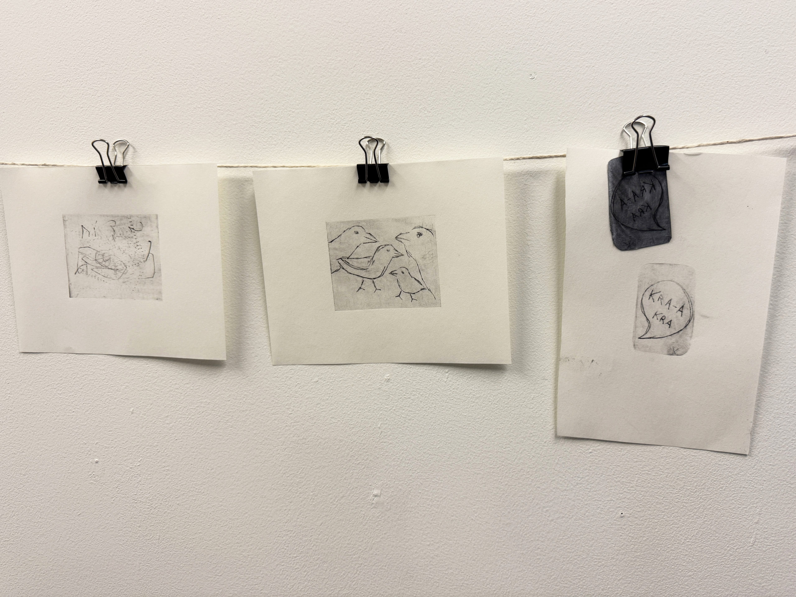 5. Heng arkene opp til tørk – og til utstilling. (De kan også ligge å tørke). Hvis dere bruker ordentlig sverte, må arkene henge en ukes tid før det er helt tørt og ikke sverter av.