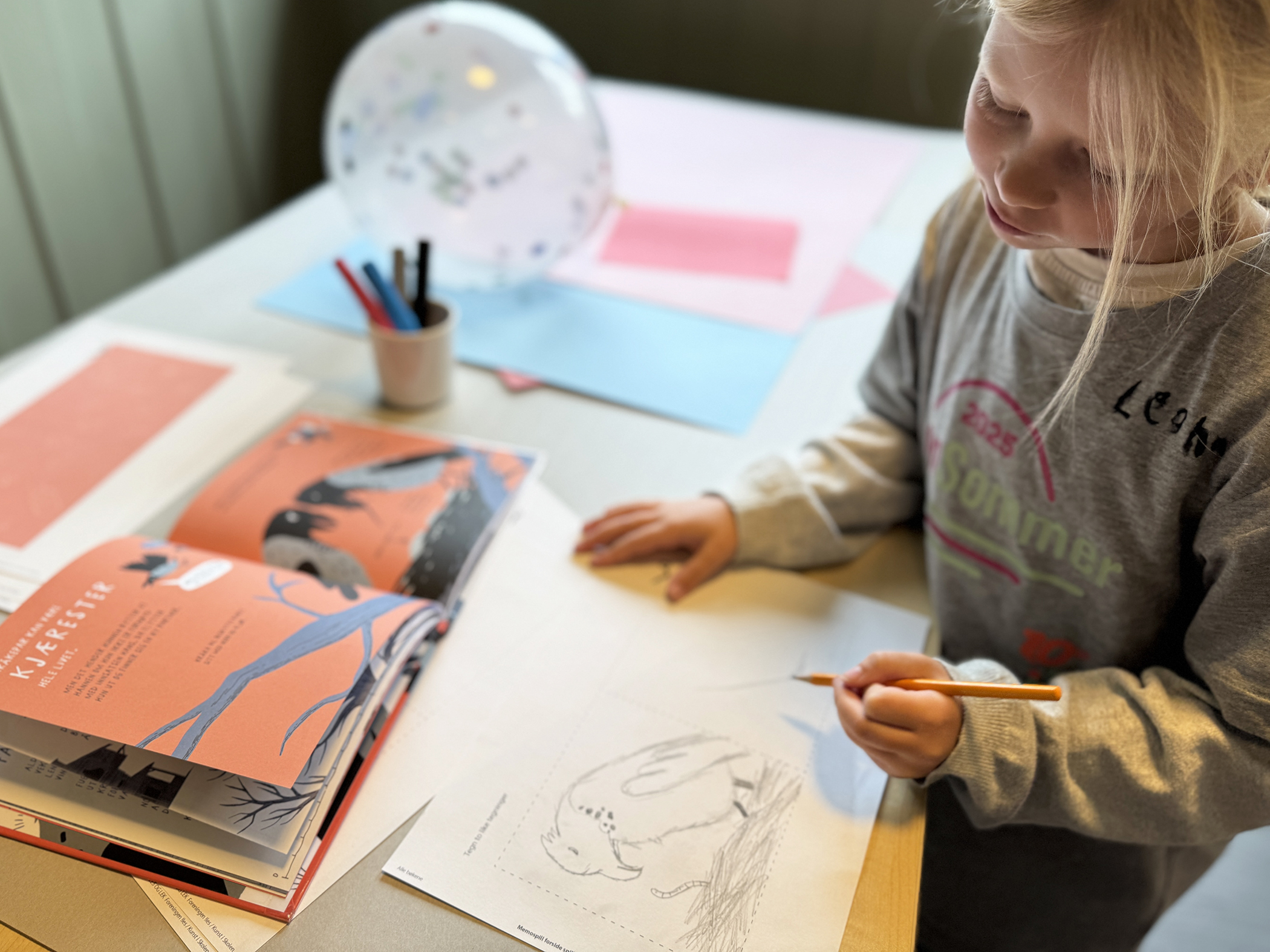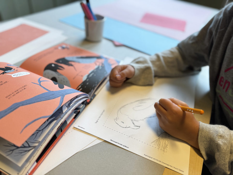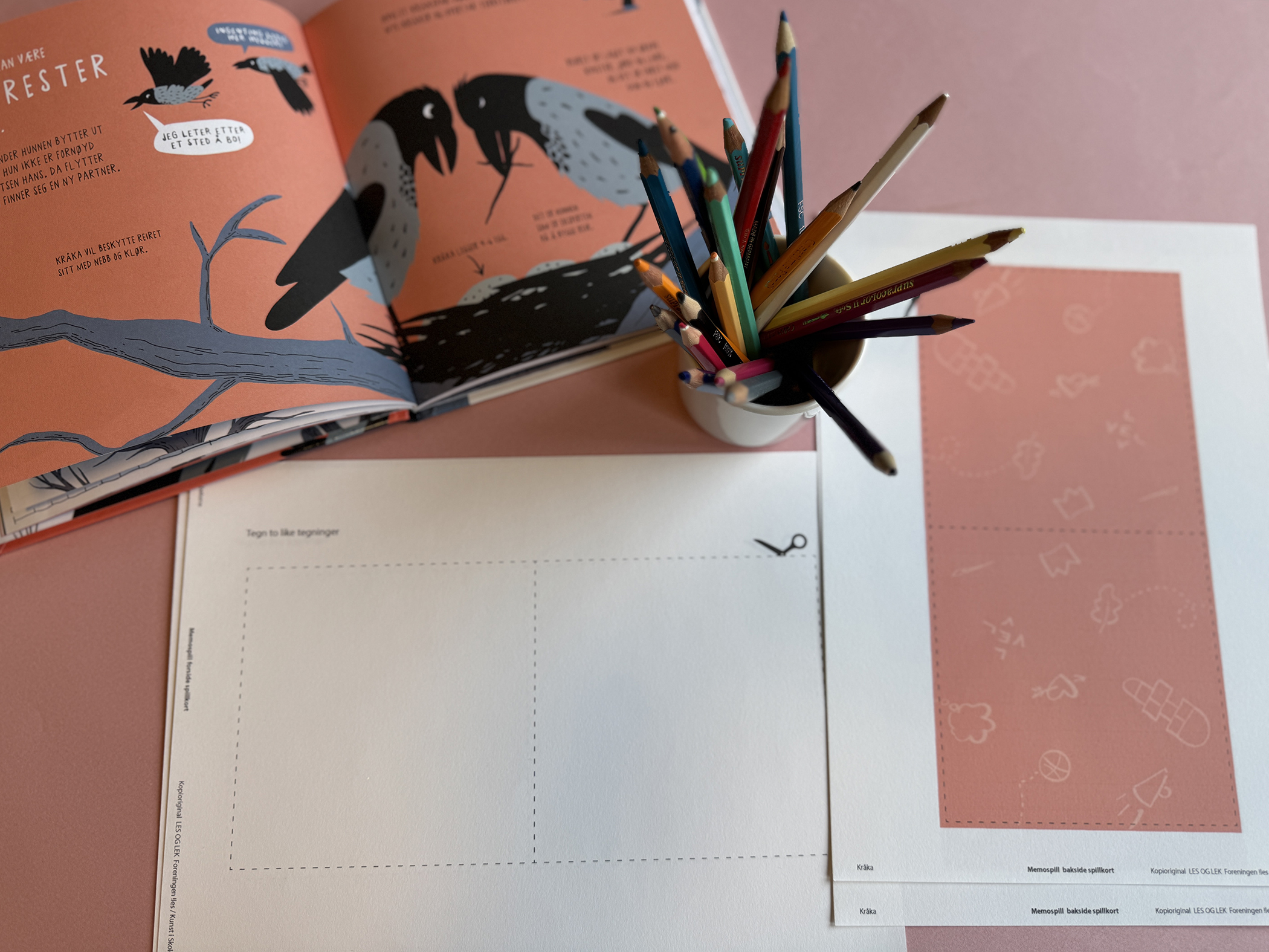 – To og to går sammen og tegner utvalgte tegninger fra boka, på hvert sitt kort, som danner kortpar til spillet. For eksempel kan en eldre elev tegne og en yngre elev fargelegge et kortpar. Dere kan også bruke matpapir til overføringstegning, og tegningene kan klippes ut og limes på tykkere papir eller papp.