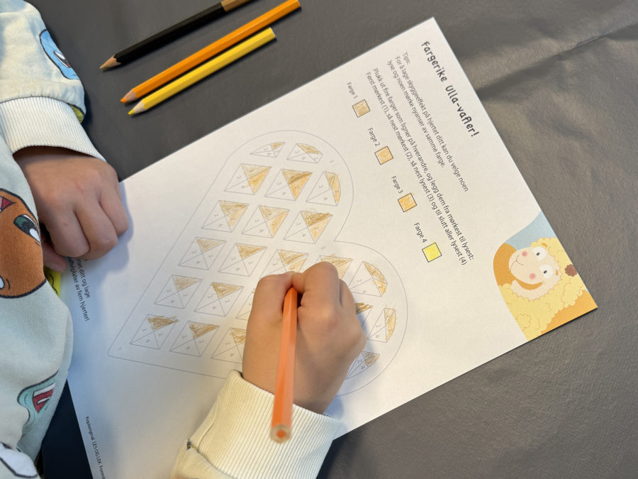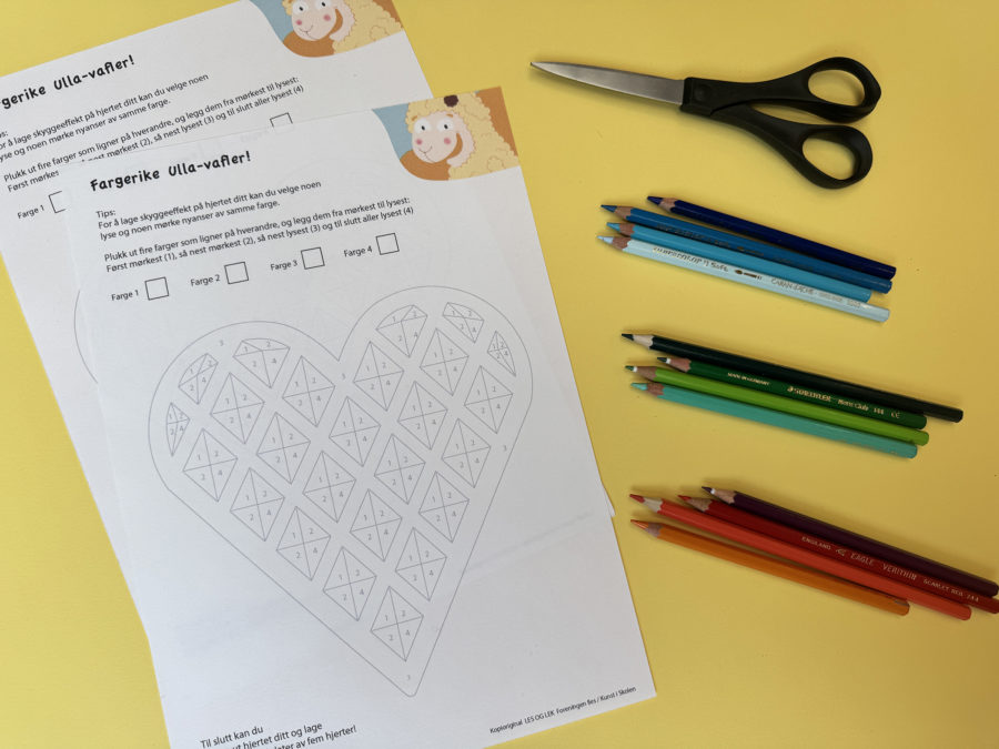 Her kan dere fargelegge vaffelhjerter med en morsom tredimensjonal effekt.