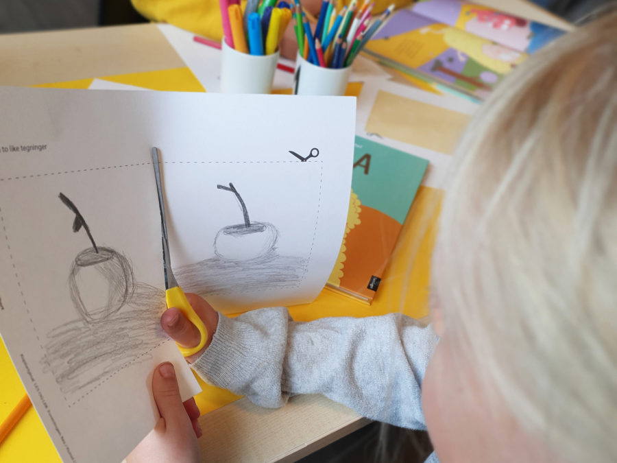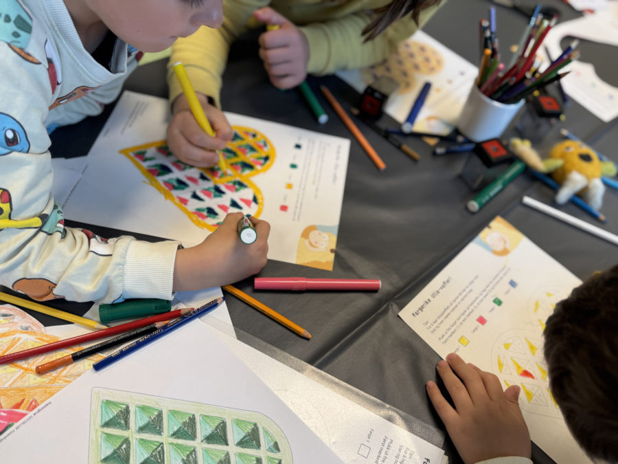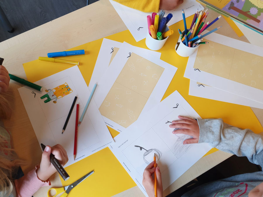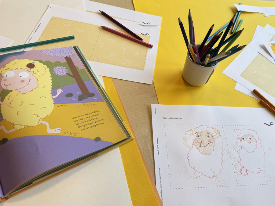 – To og to går sammen og tegner utvalgte tegninger fra boka, på hvert sitt kort, som danner kortpar til spillet. For eksempel kan en eldre elev tegne og en yngre elev fargelegge et kortpar. Dere kan også bruke matpapir til overføringstegning, og tegningene kan klippes ut og limes på tykkere papir eller papp.