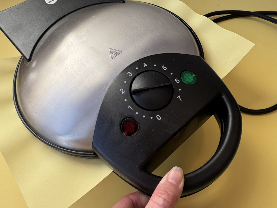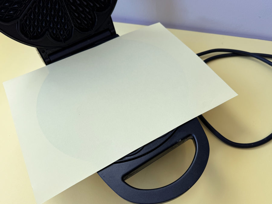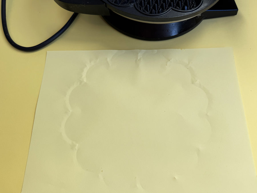 - Trykk papiret i vaffeljernet. Klem vaffeljernet hardt sammen i noen sekunder slik at det blir et fast og tydelig avtrykk. (NB: vaffeljernet skal ikke varmes opp eller kobles til strøm!)