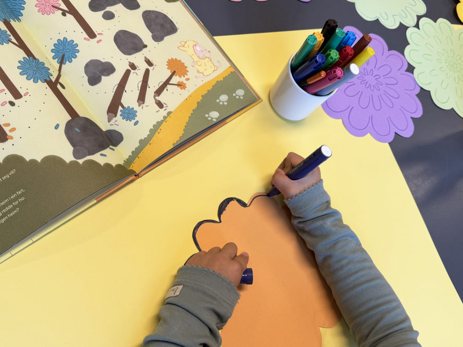 Oppmuntre gjerne barna til å se etter og «herme» etter tegningene i boka. Hvordan har illustratøren tegnet de forskjellige tingene?