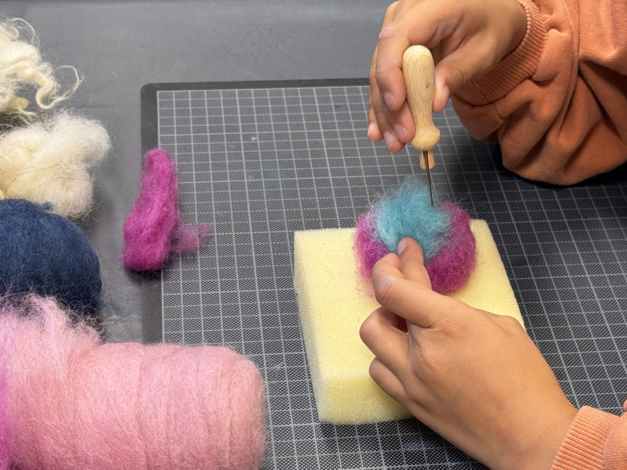 - Rull ulla sammen til et lite nøste/ball. Stikk filtenålen inn i ulla så ullhårene fester seg til hverandre (dette kalles å filte). Jo mer man stikker i ulla jo fastere blir den, på den måten kan man forme ulla og lage ulike fasonger.