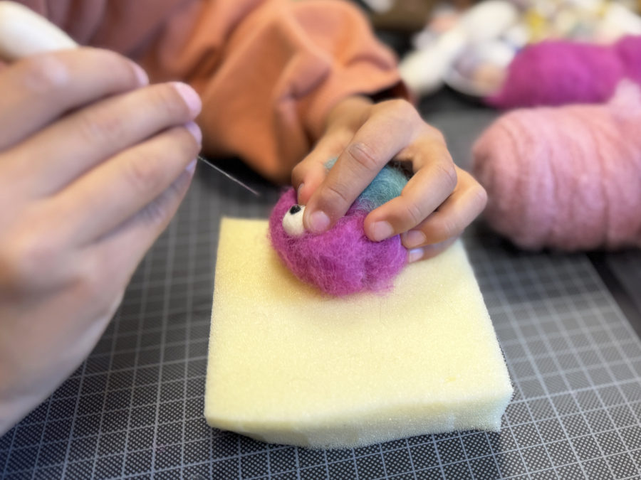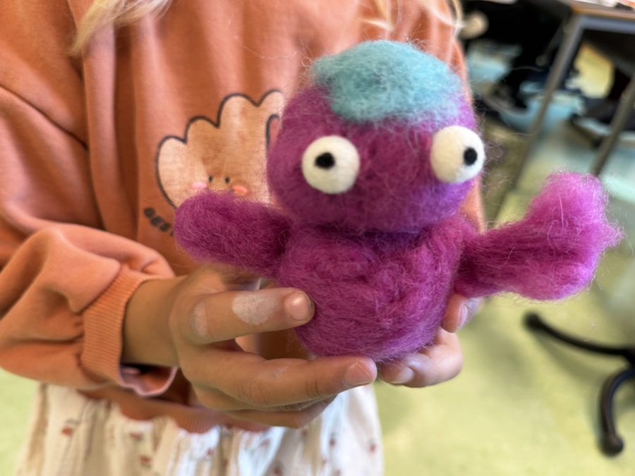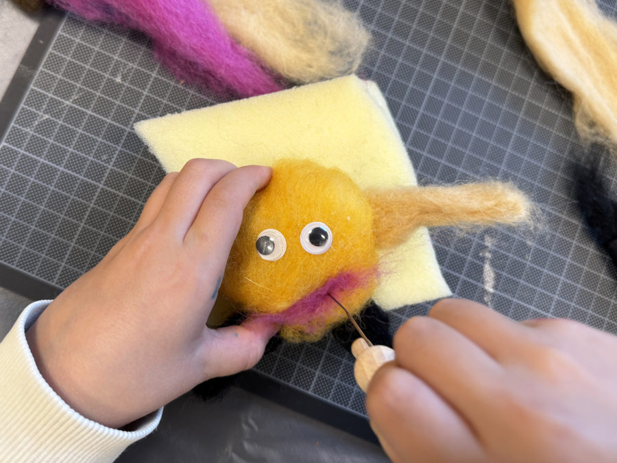 - For å lage detaljer kan man legge på et nytt lag med ull og stikke det nye laget fast til det gamle. Slik kan dere «tegne» fine detaljer. For å feste på deler som hode, armer eller øyne kan det være lurt å lage en liten grop. Deretter kan dere stikke delen litt inn i hovedformen før den festes med filtenåla.