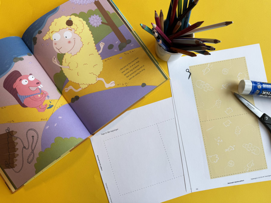 Bla i Ulla og se om dere finner tegninger av ting og figurer som dere kan tegne på kortene. Det kan for eksempel være: en sau, vaffel, blåbær, en flåte, eller en kortstokk.