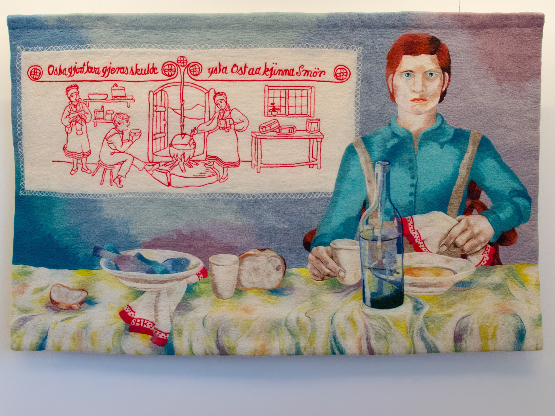 Å bruke ull på denne måten minner om maling med penselstrøk, og på avstand kan det se ut som om bildene hennes er malt og ikke tovet med ull.