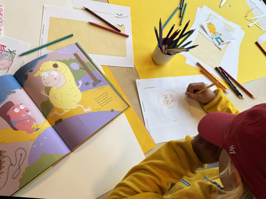 – To og to går sammen og tegner utvalgte tegninger fra boka, på hvert sitt kort, som danner kortpar til spillet. For eksempel kan en eldre elev tegne og en yngre elev fargelegge et kortpar. Dere kan også bruke matpapir til overføringstegning, og tegningene kan klippes ut og limes på tykkere papir eller papp.