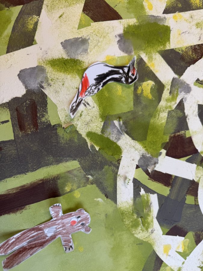 - Velg ett av dyrene. Tegn dyret. Klipp ut og plasser dyrene i “skogen” – se aktivitet “Mal en skog”.